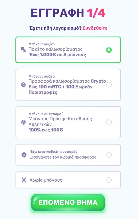 - Επιλογή μπόνους – Δυνατότητα επιλογής ανάμεσα σε μπόνους καζίνο, κρυπτονομισμάτων ή αθλητικού στοιχήματος